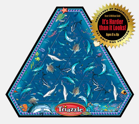 The initial Triazzle line includes 3 paperboard tray puzzles: Butterflies, Dolphins, and Poison Arrow Frogs.